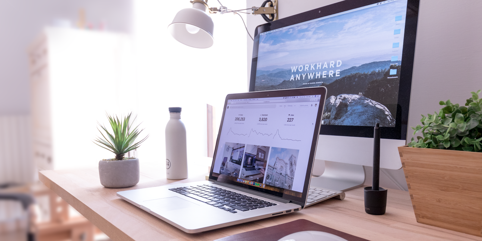 A clean, minimalist desk with a laptop and a motivational AI-related desktop background.