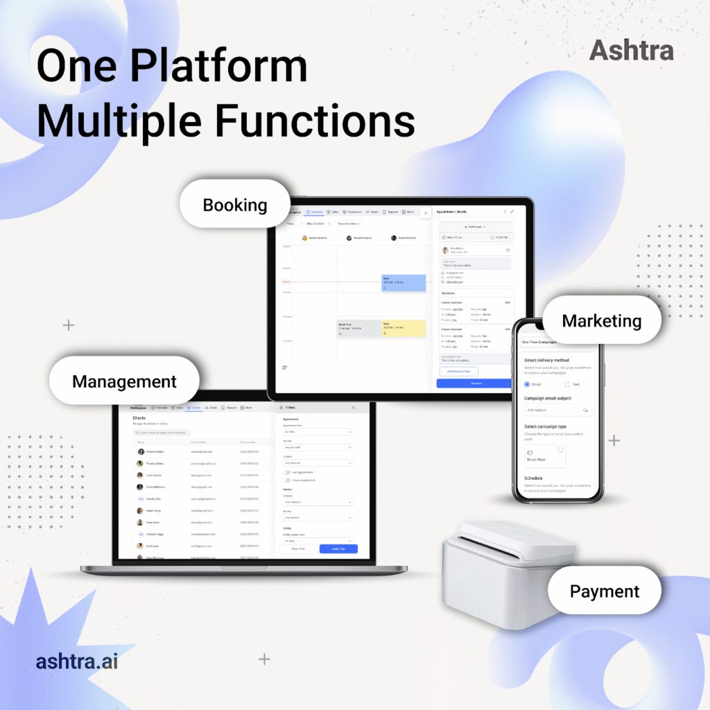 The beauty industry thrives on creativity, but growth depends on systems that work. Ashtra offers the rare combination of advanced AI technology and industry-specific design, giving beauty professionals the tools to run their businesses with confidence and vision.