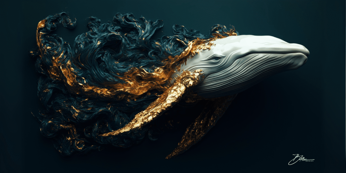 Surreal 3D artwork of a whale swimming through flowing golden and blue waves, representing freedom and grace, with a smooth, glossy finish on the whale's body.