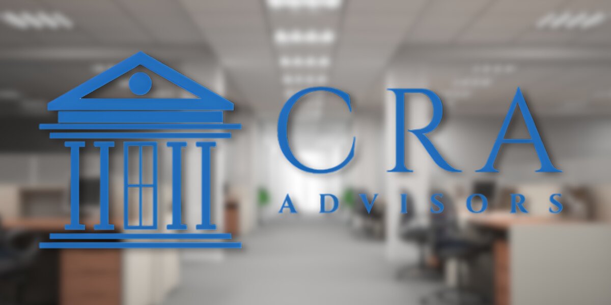 Blurred office background with a prominent blue logo on the left featuring a stylized building, and "CRA Advisors" text in blue on the right.