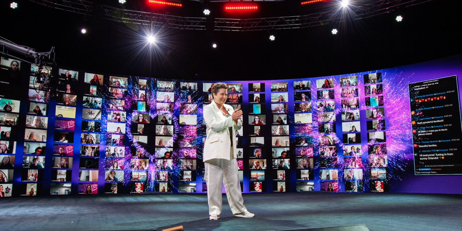 Josselyne Herman-Saccio speaking at an event, surrounded by virtual attendees displayed on large screens, celebrating her Evergreen Award.